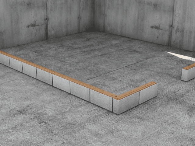 יש להניח את הבלוק הראשון כך שהשקע בתחתיתו יתחבר לתקע שבפס השעם של אשבונד. מרחו טיט בחיבור האנכי שבין הבלוק לקיר שאליו הודבק פס האיטום. המשיכו להניח את שאר הבלוקים בשורה באותו אופן, תוך מריחת טיט על הבליטה הטרפזית האנכית והצמדת הבלוק הבא. עם סיום בניית השורה הראשונה, בדקו התאמה לסימון ובצעו פילוס באמצעות סרגל ישר. במידת הצורך, החדירו קלינים מעץ בין הרצפה לבלוק עד להתקשות הטיט.