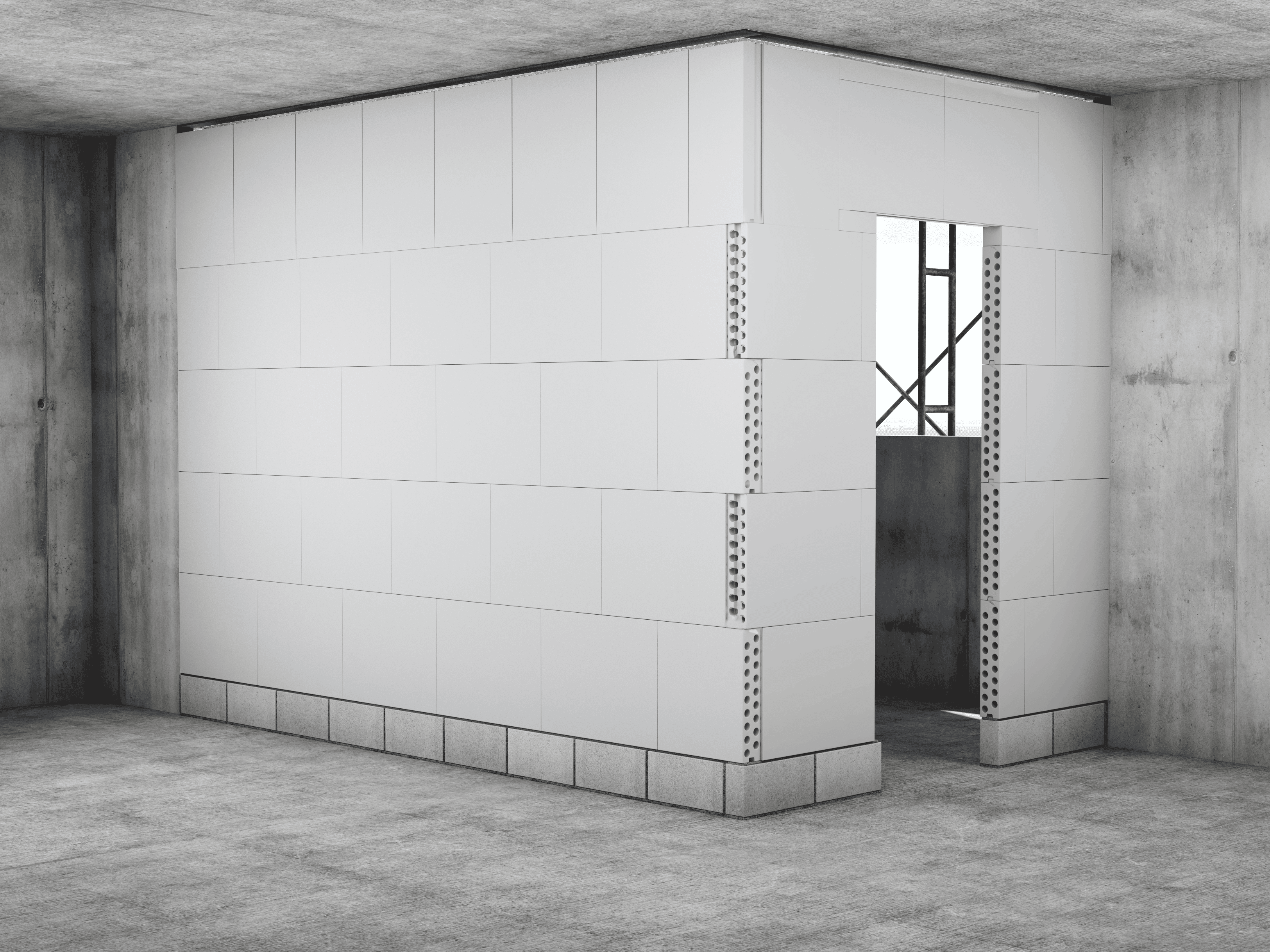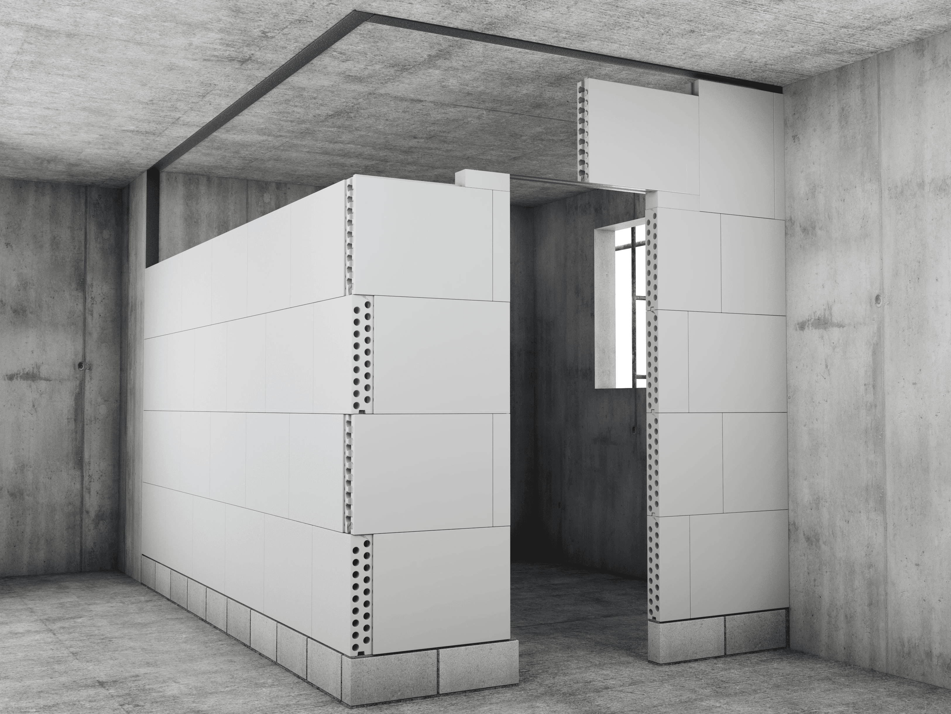 להשלמת המחיצה, הדביקו פס איטום שטוח לתקרה באמצעות טיט אשבונד. התאימו את גובה הבלוק האחרון כך שיישאר מרווח של 3.5 ס"מ מתקרת הבטון, על מנת לאפשר את הכנסת הבלוק והחדרת טיט בין הבלוק לפס האיטום. לאחר הנחת השורה האחרונה, סתמו את המרווחים בצידי הבלוק בטיט אשבונד, וצרו חריץ מבוקר בעומק 2 מ"מ לאורך המחיצה, סמוך לתקרה. בשלב הגמר, יש להדביק סרט שריון או רשת אינטרגלס לקבלת חיבור חלק ואחיד.